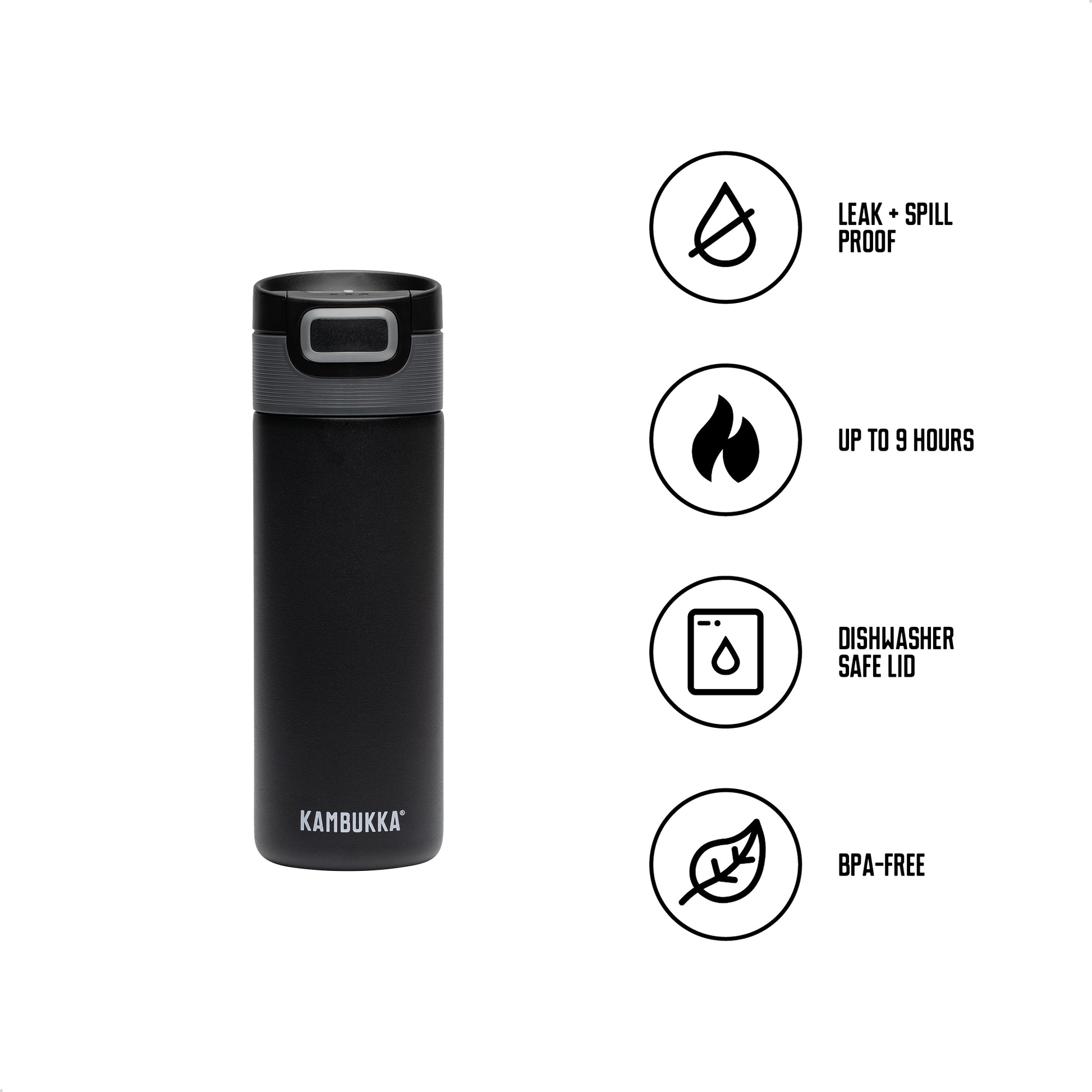 Kambukka cups, with double-wall vacuum insulation, keep drinks hot for 9 hours and cold for 18 hours.